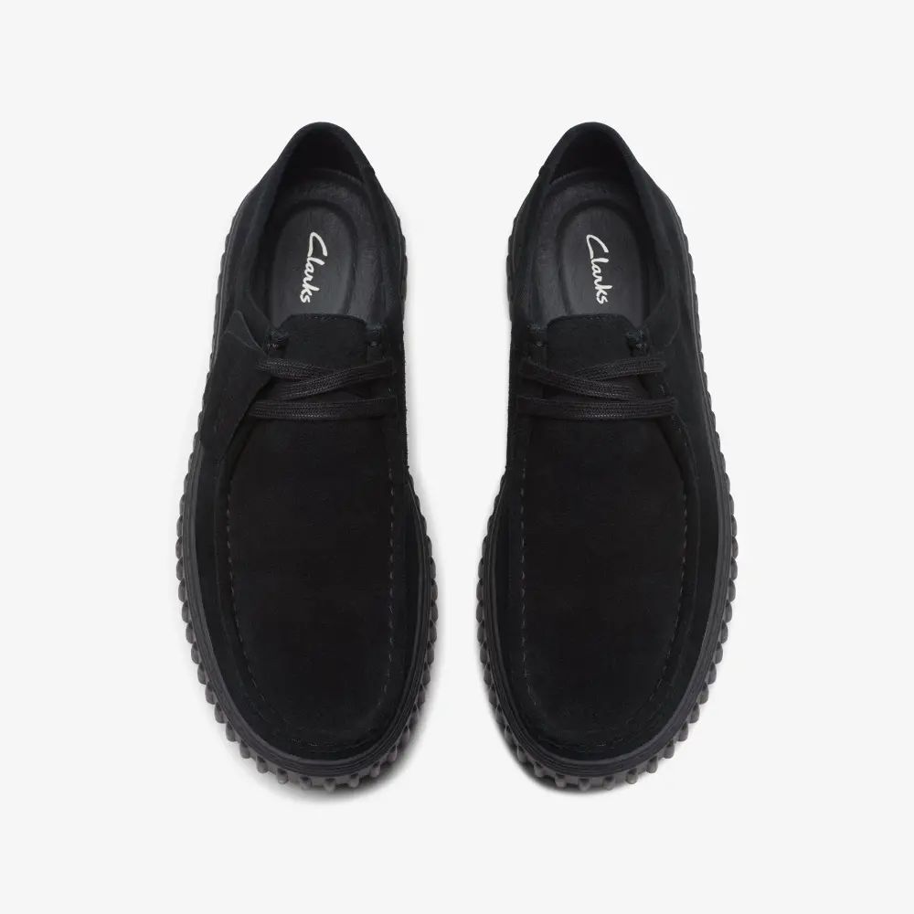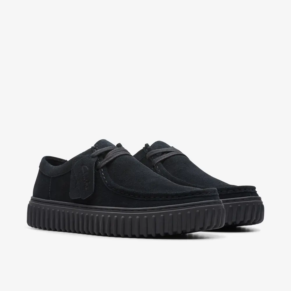 Die markante, gerippte Außensohle unseres Torhill Lo stammt aus unseren Archiven und wirkt heute genauso modern wie damals bei unserem Big Gripper aus den 90er-Jahren. Das stromlinienförmige Schnürdesign orientiert sich an den Kurven und Konturen unseres legendären Wallabee und kombiniert hochwertige Materialien mit durchdachten Details wie aufwendigen Ziernähten zu einem ultimativen, traditionsreichen Freizeitschuh. Das Obermaterial besteht aus hochwertigem, nachhaltig gewonnenem schwarzem Wildleder. Die verstellbaren Schnürsenkel sorgen für einen sicheren Halt. Das geformte, herausnehmbare Contour Cushion-Fußbett aus Leder unterstützt jeden Schritt. Die strapazierfähige, gerippte TR-Außensohle (thermoplastischer Gummi) mit EVA-Füllung bietet leichte Traktion. Zwei geprägte Anhänger sind im Lieferumfang enthalten.